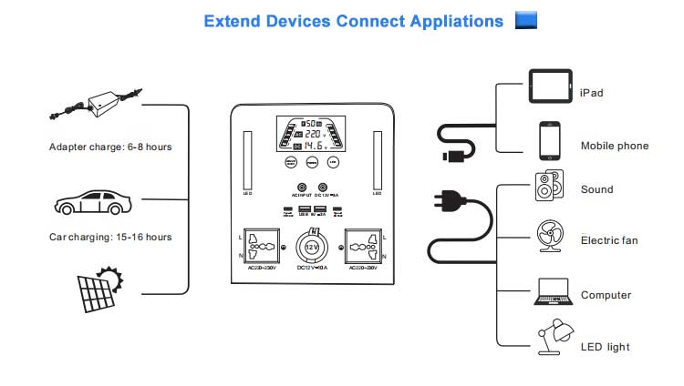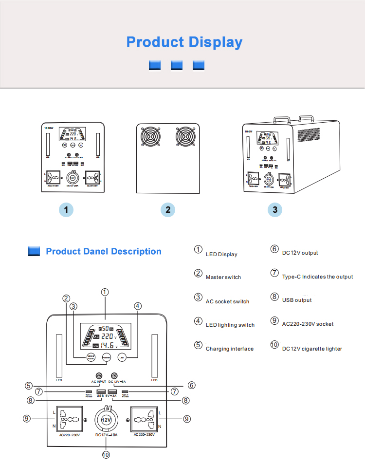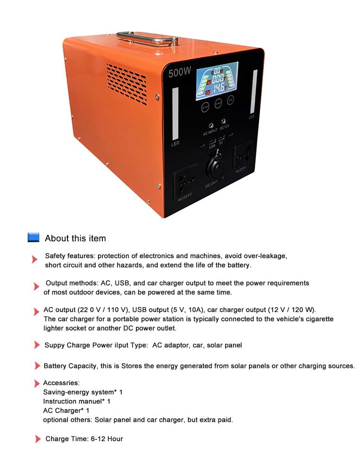 | 500W | Kalite batri: LifePO4 Kapasite batri: 12.8V 24AH | 340 * 195 * 215MM | Pwodiksyon DC: 5V USB-2 inite 5V tip-C-2 inite yo 12V siga brikè- 1 inite 12V 5A -1 inite AC pwodiksyon: 220V 500W- 2 inite | Ekonomize-enèji sistèm* 1Enstriksyon manuel*1 AC Charger * 1 lòt opsyonèl: Panèl solè ak plato machin, men siplemantè peye. |