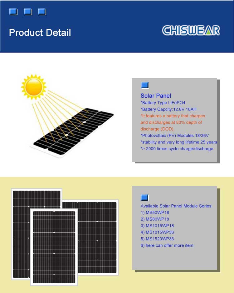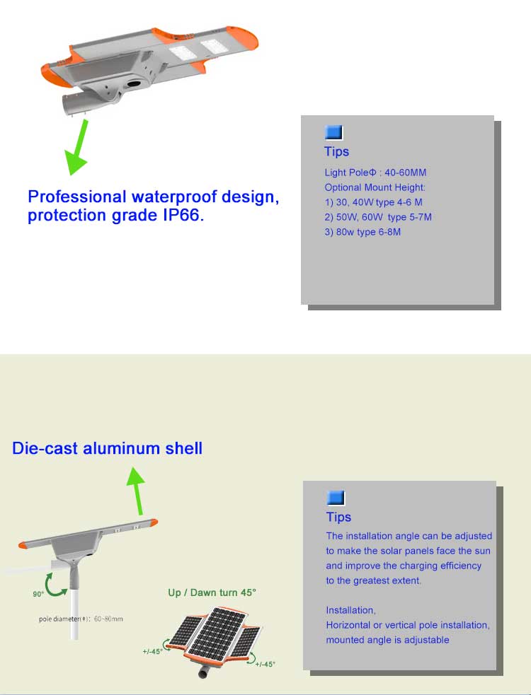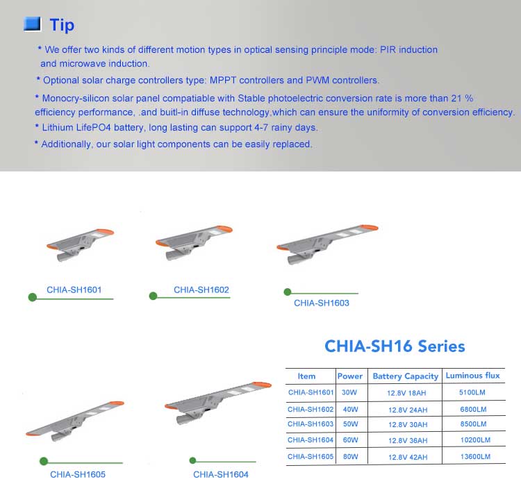 *CHIA-SH16 मालिका ॲल्युमिनियम सोलर स्ट्रीट लाईट विविध पॉवर पॅरामीटर प्रदान करतात, उदा. 30W, 40w, 50w, 80w आणि 150w.ल्युमिनस फ्लक्स 5100-34000lm, आणि लॅम्प ल्युमिनस एफिशियन्सी(lm/w) >170, बॅटरी प्रकार lifepo4 12.8V 8/24AH.