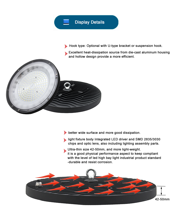 डाय-कास्ट ॲल्युमिनियम यूएफओ एलईडी हाय बे लाइट 100W, 150W, 200W एलईडी वेअरहाऊस लाइटिंग