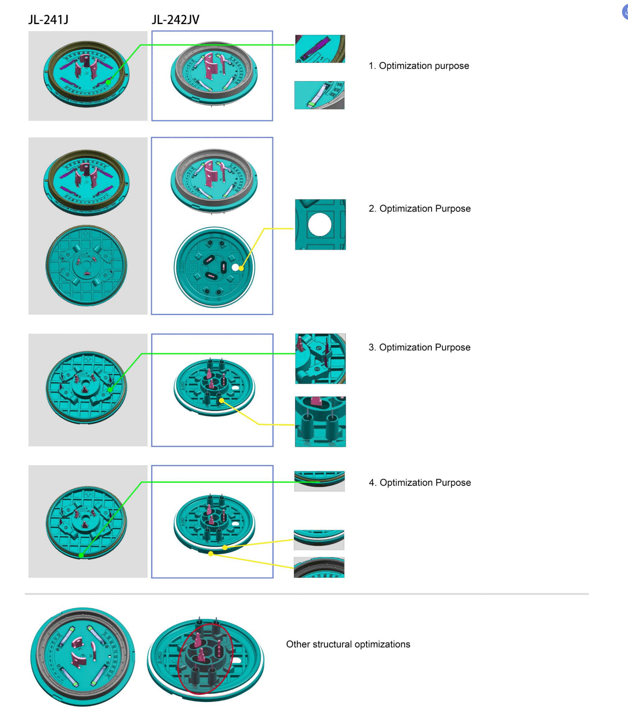 Other subtle differences in structure are due to mold optimization considerations and process processing considerations.