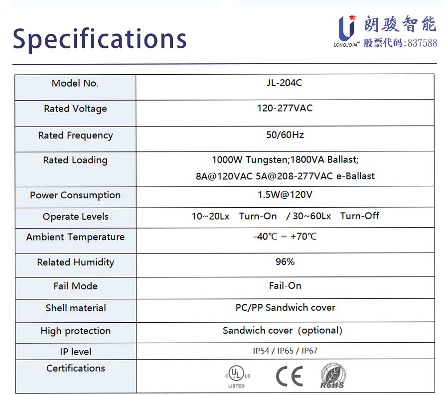 The product adopts an electronic design with a photosensitive tube and is equipped with a surge arrester (MOV). In particular, JL-204C can meet all kinds of power supply and provide customers with a wider range of voltage.