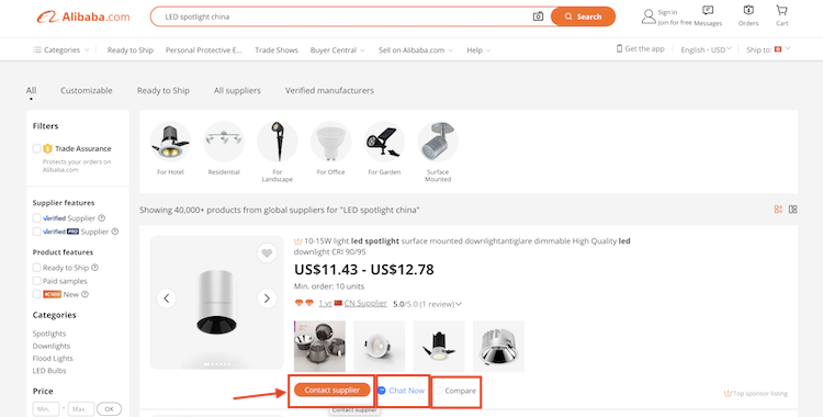 Alibaba er den største av de fem børsnoterte handelsplattformene.Du kan finne en lang liste over LED-produsenter her.Alt du trenger å gjøre er å søke etter "LED spotlight" i søkefeltet.Ikke glem å legge til "Kina" for å få den kinesiske produsenten.